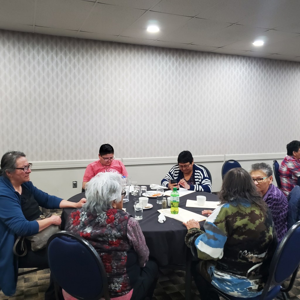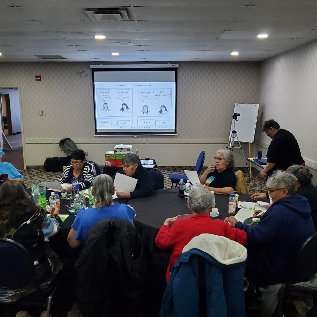 Day 1 – Consisted of reviewing picture dictionary for proper words sound and spelling for each picture. The Traditional Knowledge Keepers (TKK) worked as a large group, so they stayed in a large group setting. Agnes Whitehead began by educating all participants to the MRO Language Writing System and sound chart.